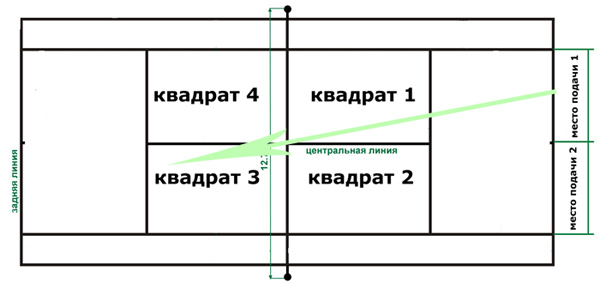 Подача. Первоочерёдность подачи, как правило, определяется обычным подбрасыванием монетки, кто угадал сторону монетки, тот и подаёт. Но Вы можете схитрить и отдать первую подачу сопернику, особенно если знаете наверняка, что подача у оппонента хромает, а сами выбрать сторону, с которой будете начинать игру. Подача выполняется по диагонали с задней линии, с первого места подачи в третий квадрат , после розыгрыша очка в гейме подающий перемещается в место подачи 2 и подаёт в 4-ый квадрат.Cмотрите рисунок: